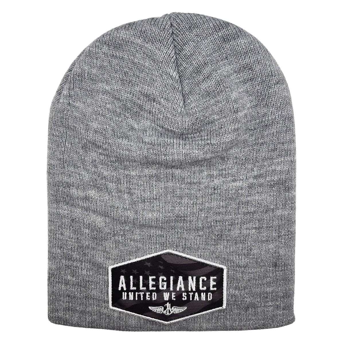The Allegiance Glory Stealth Beanie offers a clean and modern look with a patriotic edge. Right away, the heather-grey knit sets a neutral base that pairs easily with any outfit. The front features a hex-shaped patch with a sleek black background and a subtle tonal American flag tucked behind the design. The Allegiance name sits across the top in bold block lettering, while the phrase “United We Stand” anchors the center. Beneath it, the wings-and-anchor emblem adds a refined military-inspired detail that completes the look.