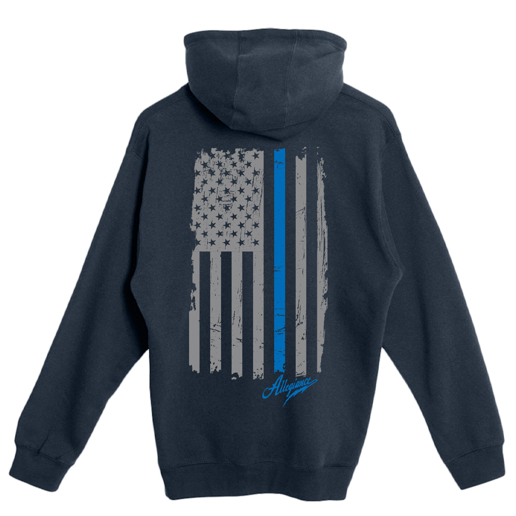 Moreover, the smaller left-chest flag mirrors the back design in a compact form, which gives the hoodie unity and balance. The artwork features chipped textures and worn detailing that create depth and character. Because of that, the hoodie captures a grit-driven, real-world style. In addition, the Allegiance script sits cleanly beneath the back flag, finishing the design without interrupting its rugged look.