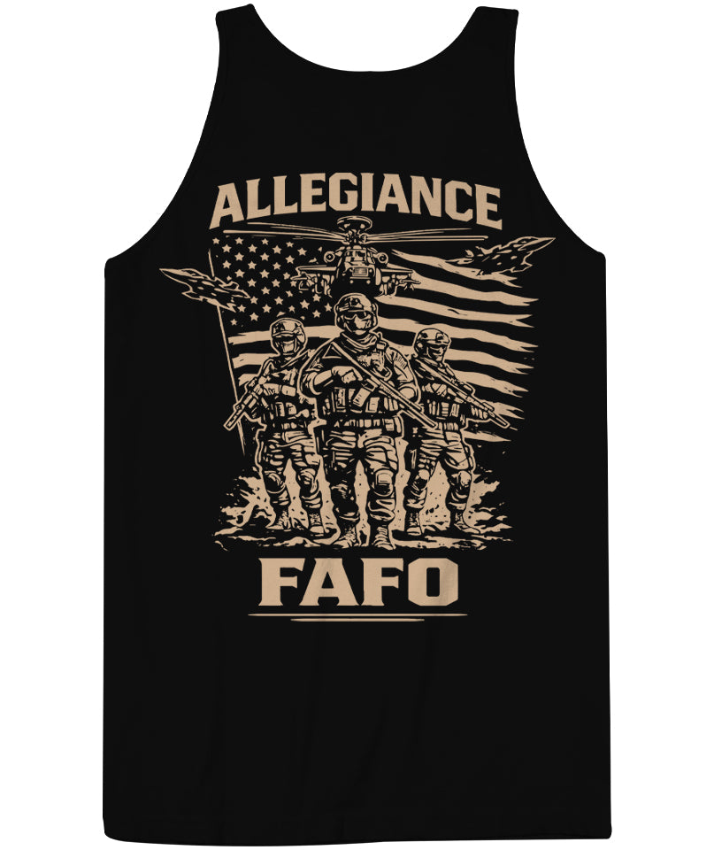 The FAFO Tank in black brings serious presence to your warm-weather lineup. The back graphic features three fully geared operators advancing forward beneath a distressed American flag. Above them, ALLEGIANCE arches across the top, while jets streak across the sky and a helicopter hovers overhead. Beneath the scene, FAFO locks in the message.