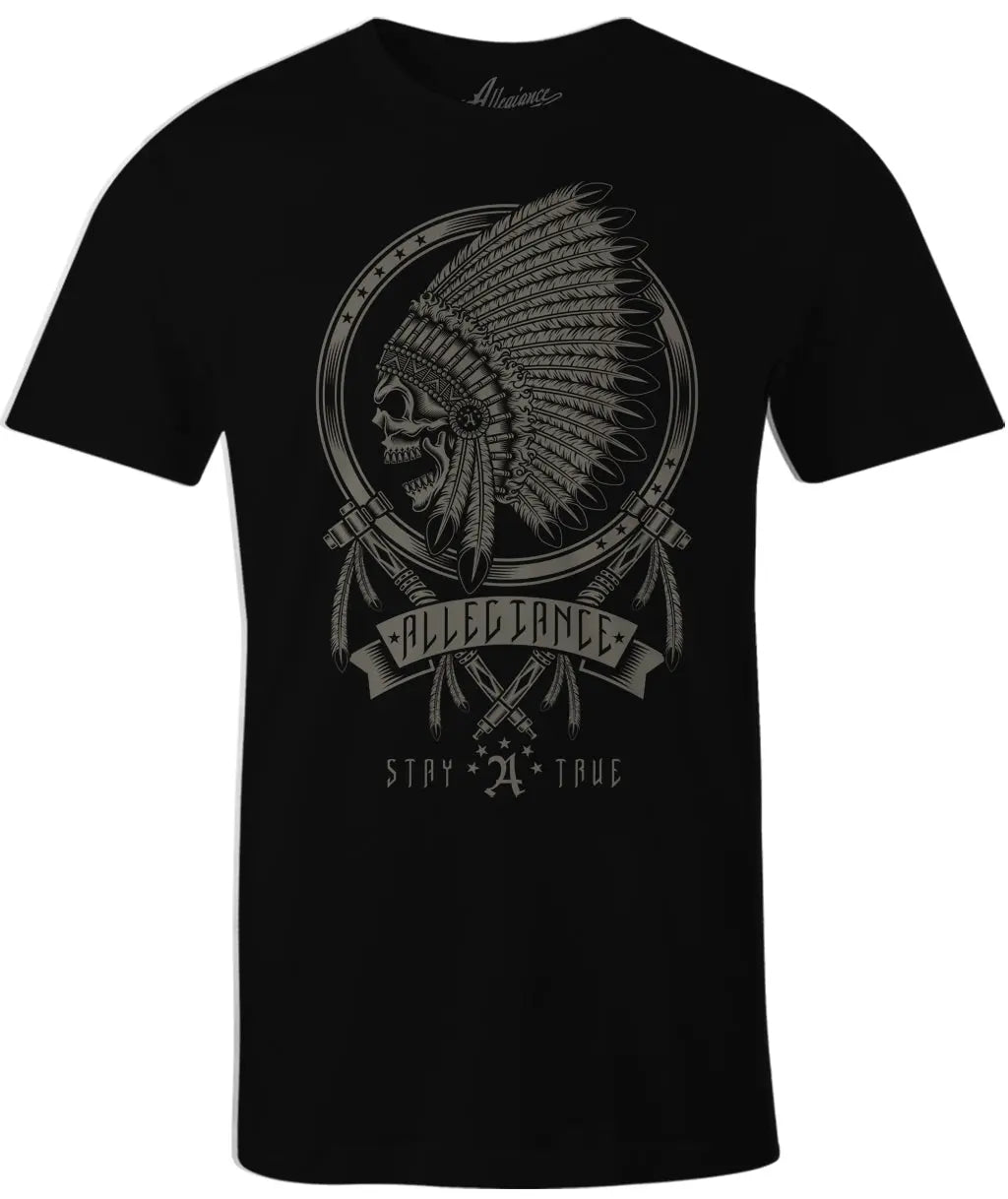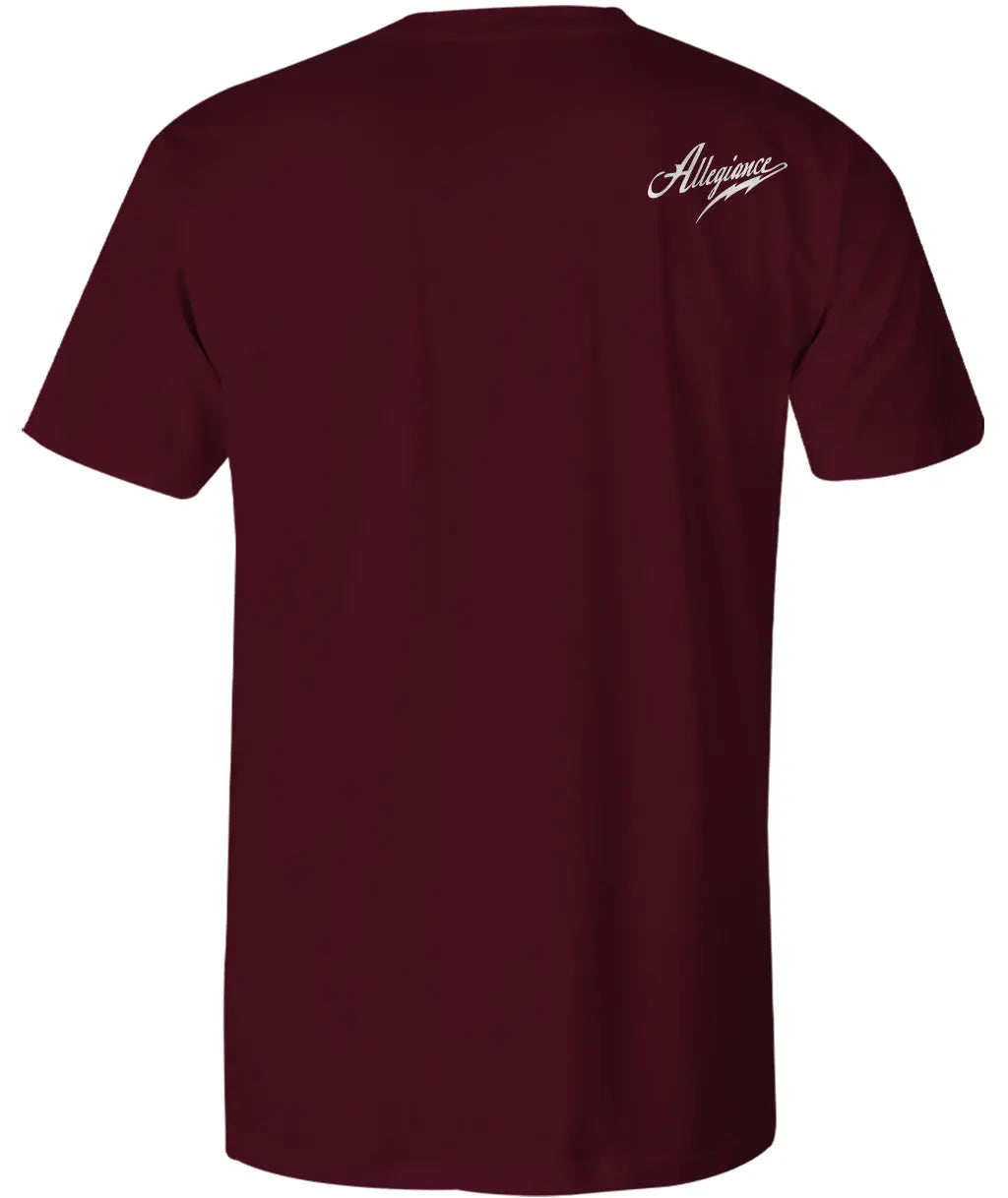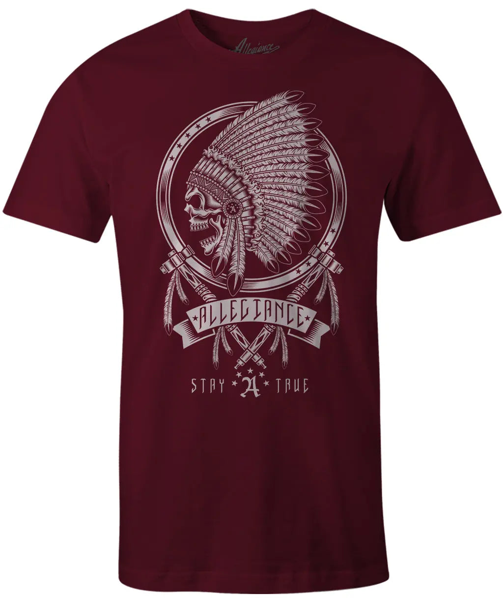 Introducing the Allegiance Peace Pipes Tee! This tee is sure to make a statement with its Native American inspired Peace Pipes logo screen printed big on the front. It's 100% cotton construction makes it soft and comfortable to wear, and it's machine washable for easy care. Plus, it's made in the USA! The tee is available in black and maroon.