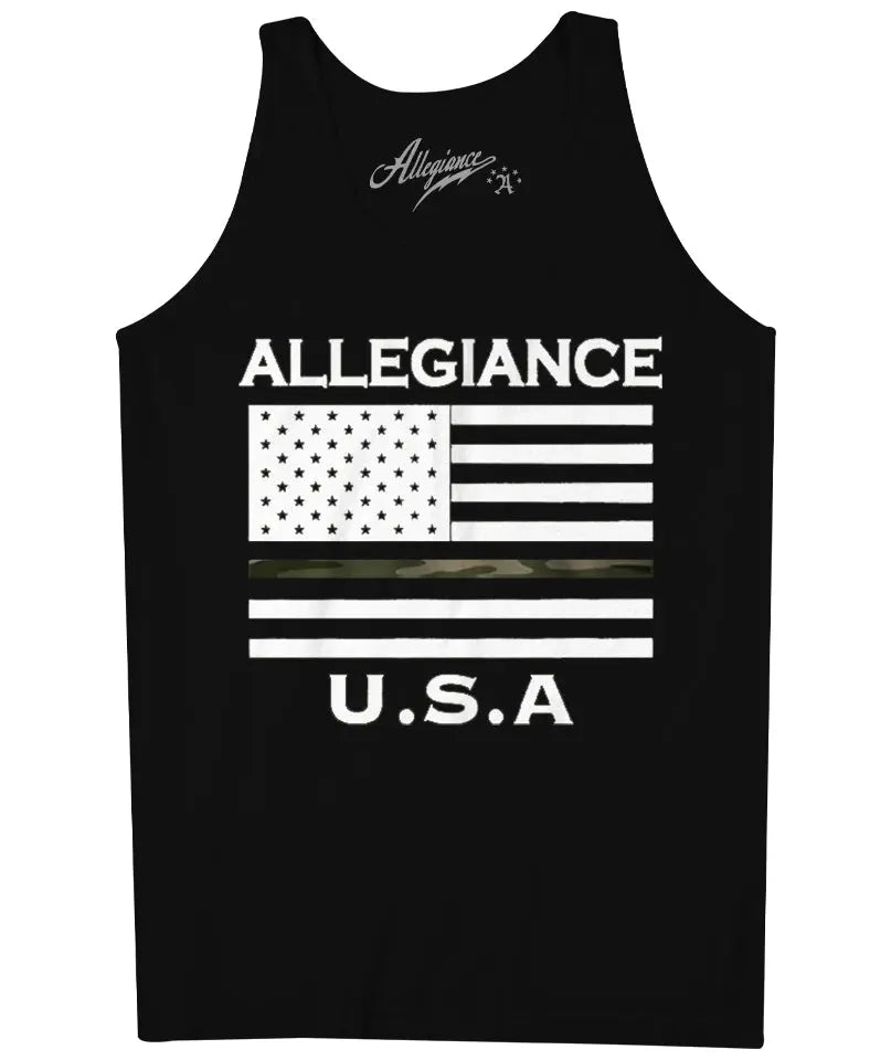 Stand out in the Allegiance USA Flag Tank Top! This Tank features the USA Flag with a Camo Filled Line screen printed large on the front and a small classic logo on the back. It’s 100% cotton and machine washable. Designed and printed in the USA.